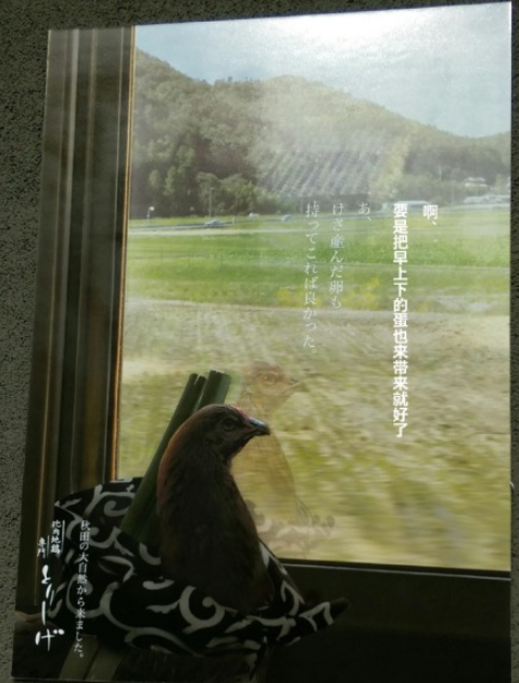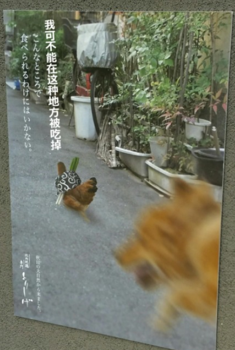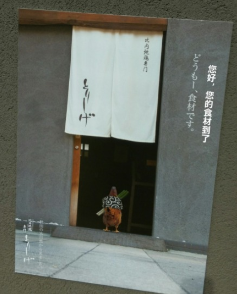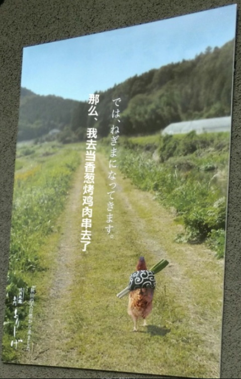 这是日本一家鸡肉料理店的海报,讲述了一只决心要成为最美味的葱烧鸡肉串的鸡中战斗鸡历经千难万险最终到达料理店的感人肺腑的励志故事。