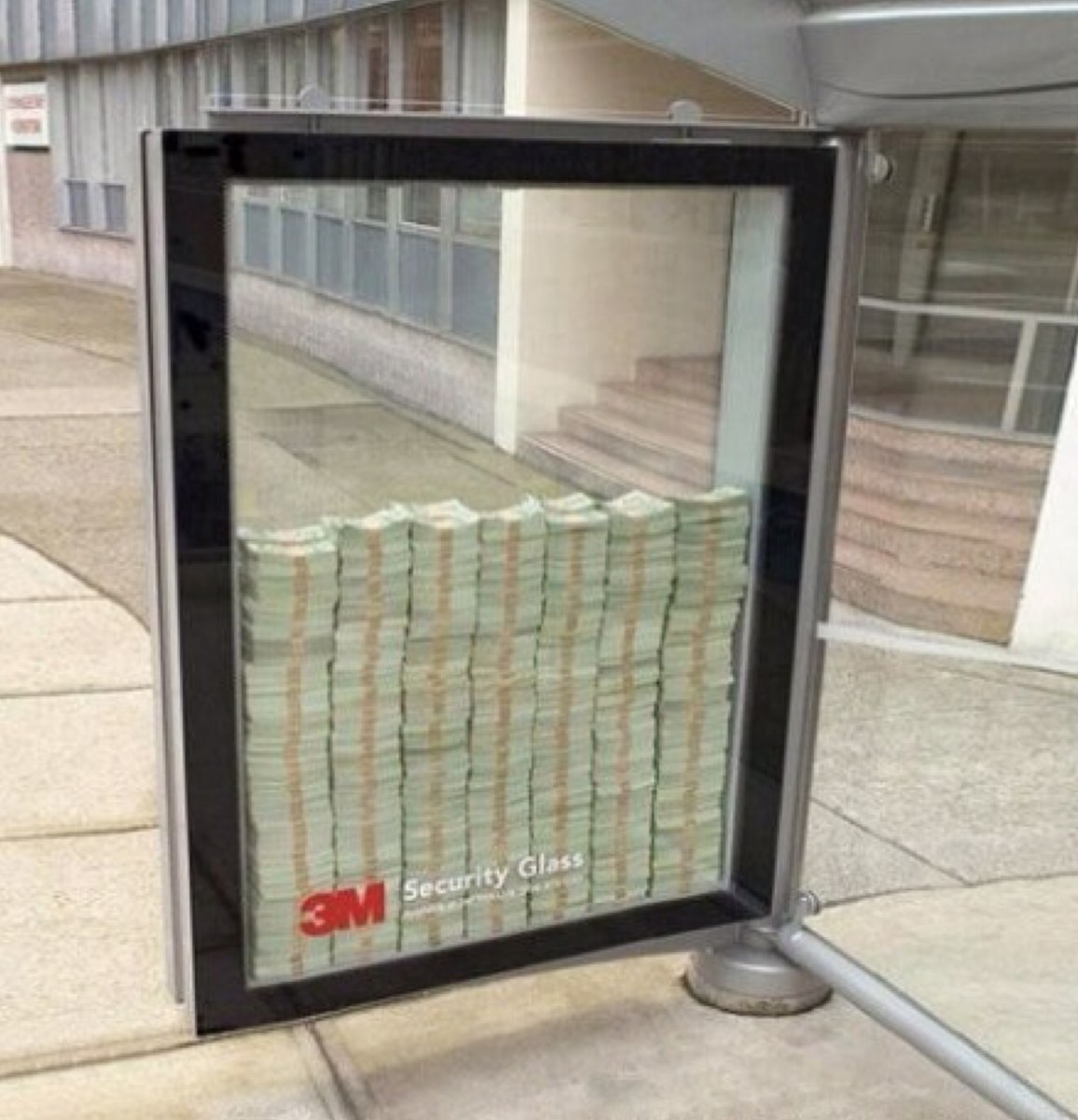 3M安全玻璃户外创意广告,世界上最遥远的距离,是美金在里头,而我在外头。想拿钱?那就先打碎3M安全玻璃吧~