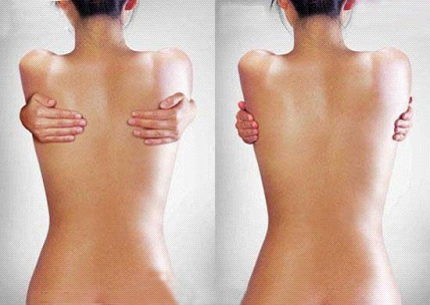 这张广告对比图很简单,只有一个女人手往后抱的姿势,唯一的区别是两只手在背后的距离变长了。